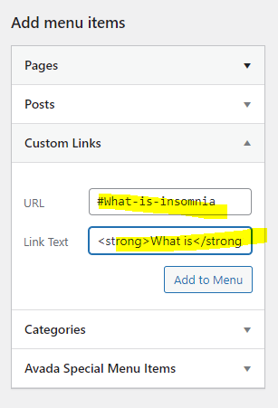 - for example, if the first section's Menu anchor was "what-is-insomnia" then you will put "#what-is-insomina"