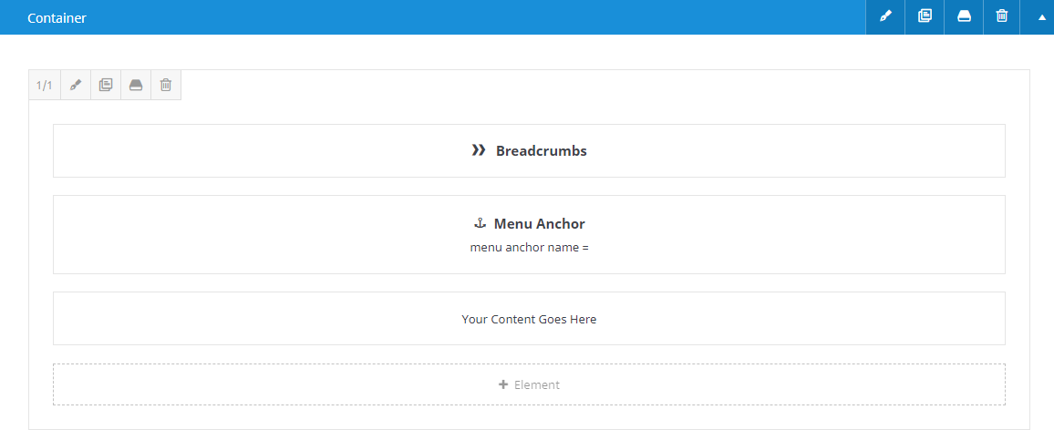 - Add the first three elements to the page, Breadcrumbs, Menu Anchor, Text Block