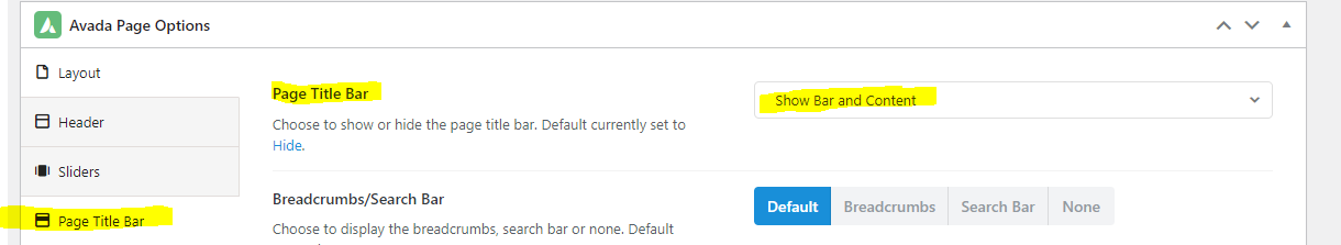 - Go to the bottom of the page to "Avada Page Options" and select the page title bar